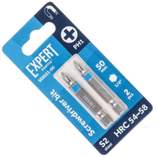 Бита для шуруповерта магнитная PH1 50 мм 2 штуки STARTUL Expert с шестигранным хвостовиком 1/4". Изготовлена из стали S2.