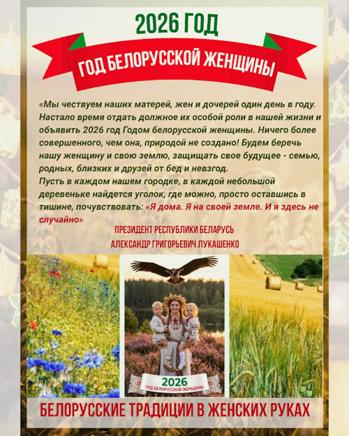 Президент Беларуси Александр Лукашенко подписал Указ № 1, которым 2026 год объявлен Годом белорусской женщины. Этот документ принят в целях формирования национального образа женщины-труженицы, популяризации роли женщин в сохранении и развитии общества, уважения к той роли, которую женщина играет в жизни нашей страны.
