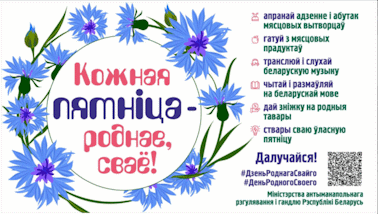 Министерством антимонопольного регулирования и торговли Республики Беларусь (далее – МАРТ) при поддержке Белтелерадиокомпании и иных заинтересованных запущен проект «Кожная пятніца – роднае, сваё» (далее – проект), направленный на повышение культуры потребления, продвижение отечественных товаров, популяризацию их качества, разнообразия белорусских блюд, красоты родного языка.