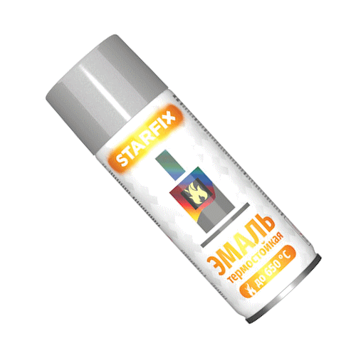 Краска-эмаль аэрозольная термостойкая силиконовая STARFIX серебристый 520мл - предназначена для окрашивания металлических (стальных, чугунных) поверхностей, подвергающихся воздействию высоких температур (до 650 °С): составные части выхлопной системы автомобилей, элементы трубопроводов и паропроводов, детали водонагревательного, котельного и прочего оборудования, камины, барбекю, радиаторы отопления и др.Способ и условия нанесения: не наносить на горячие поверхности! t окрашиваемой поверхности должна быть на 5 °С выше точки росы, t баллона - не ниже 10 °С и не выше 40 °С. Перед нанесением баллон встряхнуть в течение 2-3 мин после появления стука шариков, а также периодически встряхивать во время использования. Сделать пробное распыление. Распылять в вертикальном положении с расстояния 25-30 см от поверхности в 2-3 тонких слоя с промежуточной сушкой 5-7 мин.