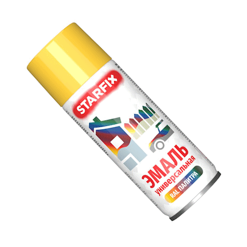 Краска-эмаль аэрозольная универсальная желтый 1018 STARFIX 520 мл применяется для быстрого и равномерного окрашивания, декоративного оформления и ремонта небольших по размеру объектов и бытовых изделий, элементов ландшафтного, интерьерного дизайна, не подвергающихся механическим нагрузкам. Рекомендуется нанесение по плотным минеральным поверхностям: бетонным, кирпичным, оштукатуренным, гипсокартонным, из искусственного и натурального камня, неглазурированной керамики, щебня; по металлическим поверхностям, в т. ч. окрашенным ранее порошковыми красками (наружные стенки холодильников, стиральных машин, микроволновых печей и т.п.), по натуральным плотным тканям (плакаты, элементы одежды), эксплуатирующимся в атмосферных условиях и внутри помещений. Возможно применение для окраски и декорирования изделий из древесины (элементы мебели, рамки для фото, окна, двери, и др., кроме полов) и стекла, эксплуатирующихся внутри помещений.