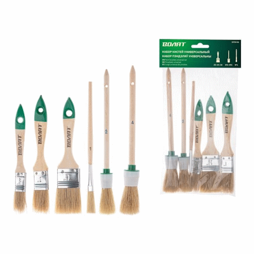 Набор кистей ВОЛАТ 6 предметов используется для малярных работ, нанесения лаков и масляных красок. Состав набора: плоские кисти 20 мм (3/4"), 25 мм (1"), 35 мм (1,5"), круглые №2, №4, корректирующая кисть №10. Тип щетины - натуральная светлая щетина.