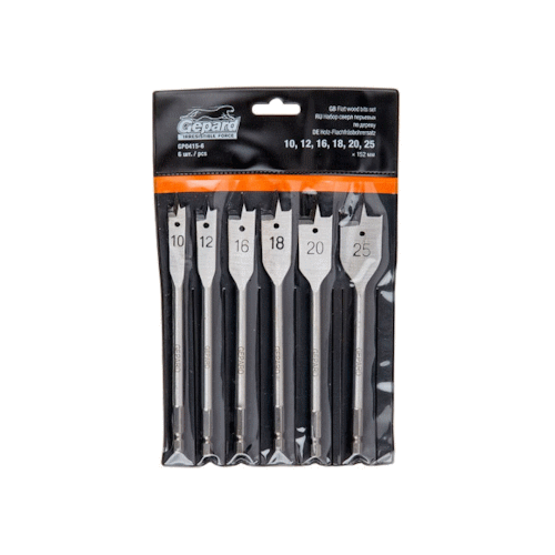 Набор сверл по дереву 6 штук GEPARD состоит из перьевых сверл длинной 152 мм . Сверла с боковыми подрезателями (зубцами). Вертикальная заточка центрирующего острия, а также заточка углубления кромки (плечевое заострение). Сверла изготовлены из высококачественной углеродистой инструментальной стали для сверления глухих и сквозных отверстий в мягкой и средней твердости древесине и легких строительных материалах, таких как гипсокартон. Надежно фиксируются в кулачковом патроне без проскальзывания. Высокая скорость сверления. Тип хвостовика шестигранный (1/4" / 6.35мм). Комплект (сверла диаметром) 10, 12, 16, 18, 20, 25 мм.