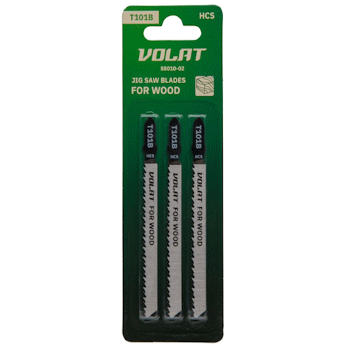 Пилка для электролобзика ВОЛАТ по дереву T101B 3 штуки – сменный пильный элемент по ламинату для электролобзиков. Используются для прямых тонких пропилов в мягкой древесине, ДСП, столярных плитах, ДВП (3 – 30 мм), полимерных/эпоксидных материалах (<30 мм). Пропил прямой, тонкий, аккуратный и чистый рез. Изготовлены из инструментальной высокоуглеродистой стали SK5.
