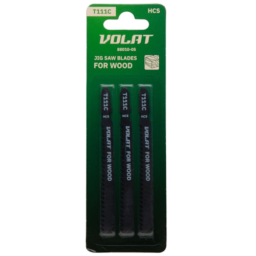Пилка для электролобзика ВОЛАТ по дереву T111C 3 штуки – сменный пильный элемент по дереву для электролобзиков. Используются для быстрых прямых пропилов в мягкой древесине (4 – 50 мм), ДСП, столярных плитах, ДВП. Пропил прямой, грубый, для базовых работ. Изготовлены из инструментальной высокоуглеродистой стали SK5.