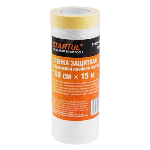 Пленка укрывная с бумажной клейкой лентой 1,5х15 м STARTUL Profi применяется для внутренних работ на средних и больших шероховатых поверхностях внутри помещения, защищает поверхности при выполнении малярно-штукатурных работ. Плотно прилегает к поверхности за счет электростатического заряда. Клейкая лента в высоту составляет 1,5 см, толщина составляет 155±5 мкм.