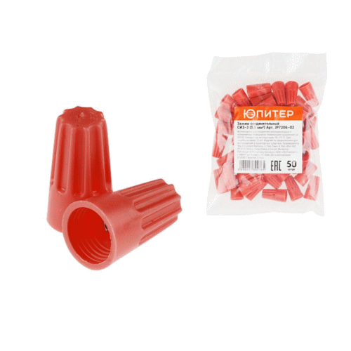 Соединительный зажим ЮПИТЕР СИЗ-3 5,5 мм2 50 штук представляет собой колпачок из прочной пластмассы с установленной в него оцинкованной стальной пружиной квадратного сечения. Используется для соединения медных или алюминиевых проводов при монтаже и ремонте электропроводок любых типов зданий и сооружений. Зажим СИЗ вручную накручивается на зачищенные концы проводов, соединяет их, изолирует место контакта и обеспечивает надежный контакт в течение всего времени эксплуатации электропроводки.