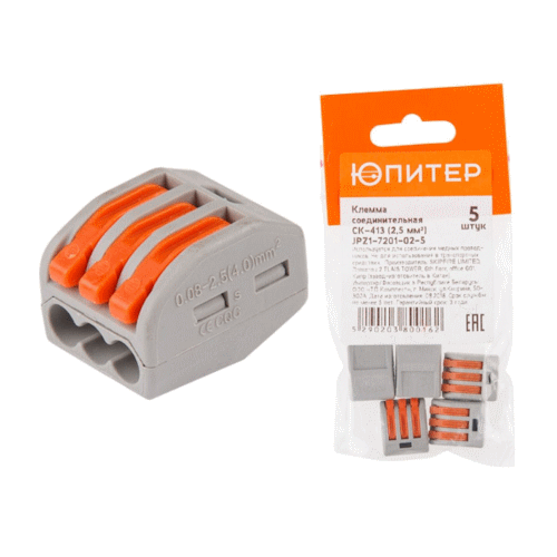 Клемма ЮПИТЕР СК-413 2,5 мм2 5 штук используется для присоединения и ответвления до 3 одножильных проводников сечением от 0,1 мм² до 2,5 мм² в электрических цепях переменного тока с частотой 50Гц напряжением до 380В. Соединительная клемма обеспечивает быстрый монтаж и демонтаж проводников без дополнительных инструментов, а также создает надежное соединение медных многожильных и одножильных проводников от 0,1 до 2,5 мм2. Благодаря утопленному рычажку исключено случайное отключение при монтаже в тесном пространстве. Имеет тестовое отверстие для возможности измерения электрических параметров без разбора и нарушения изоляции соединения. Сечение проводников 2,5 мм2. Количество подключаемых проводников – 3.