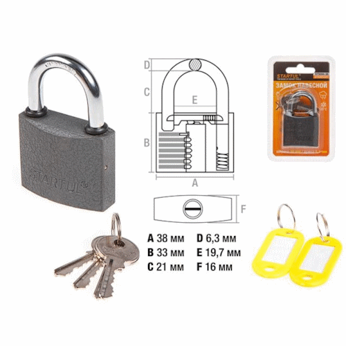 Замок навесной 38 мм STARTUL Standart отличается небольшими габаритами. Дужка из закаленной высококачественной стали, высокопрочный чугунный корпус и хромированное покрытие обеспечивают надежность и долгий срок службы. Латунный механизм секрета. Автозапирание. Устойчив к любым погодным условиям. Диаметр дужки: 6,3 мм. В комплекте: 4 ключа, 2 брелока.